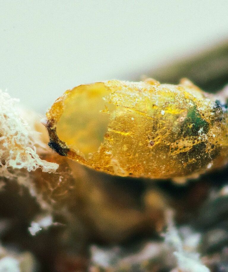 The female Anagyrus vladimiri lays its eggs inside the body of the mealybug. Upon hatching, the larvae feed on the internal tissues of the mealybug, gradually consuming it from within. This internal feeding ensures the larval wasps have a constant and protected food source, eventually leading to the death of the host.