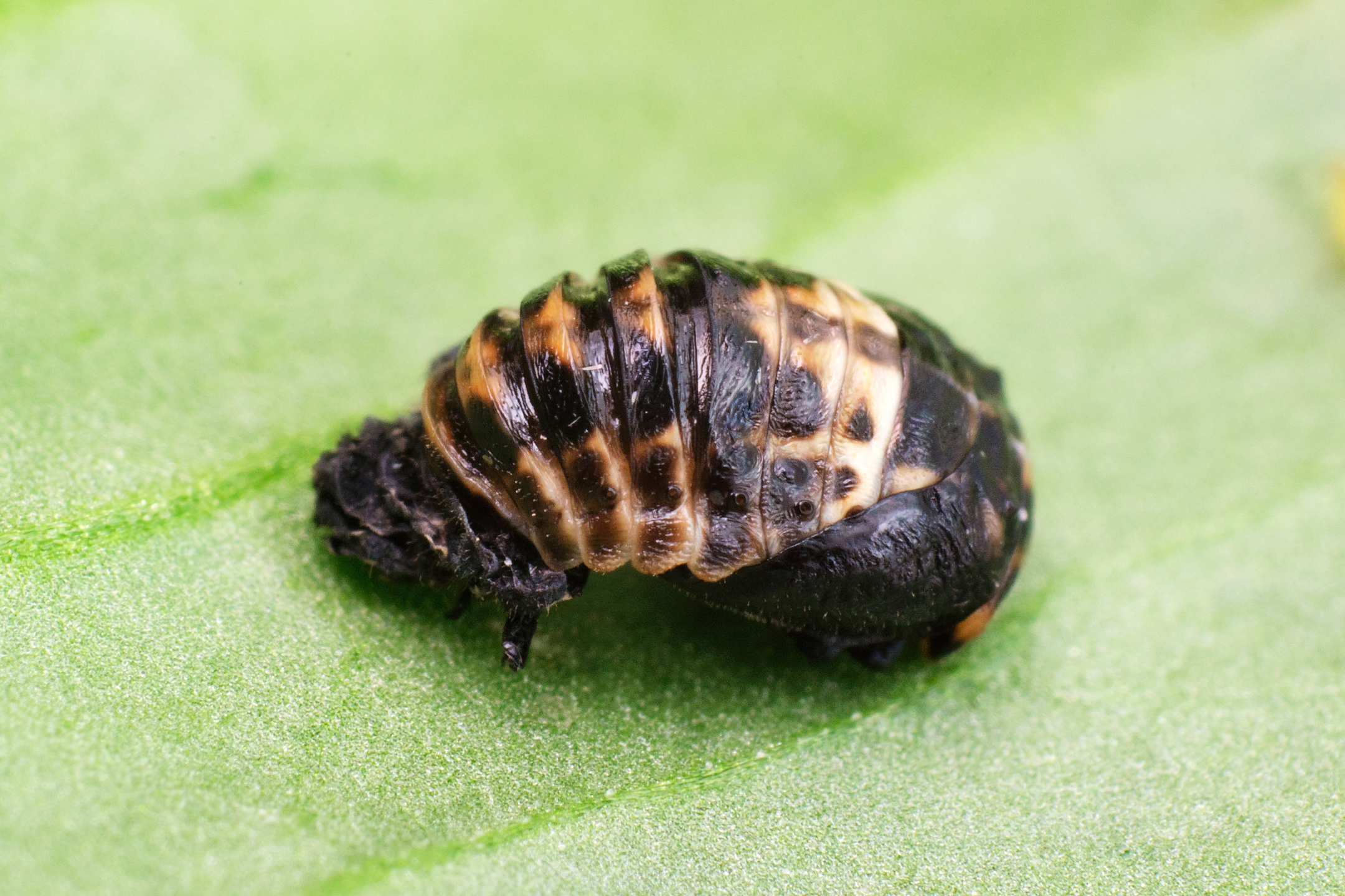 Pupal stage: Adalia bipunctata pupae are stationary and resemble small, elongated ovals. They can vary in color from pale yellow to light brown depending on environmental conditions. Pupae are often found attached to plant surfaces or hidden in sheltered locations.