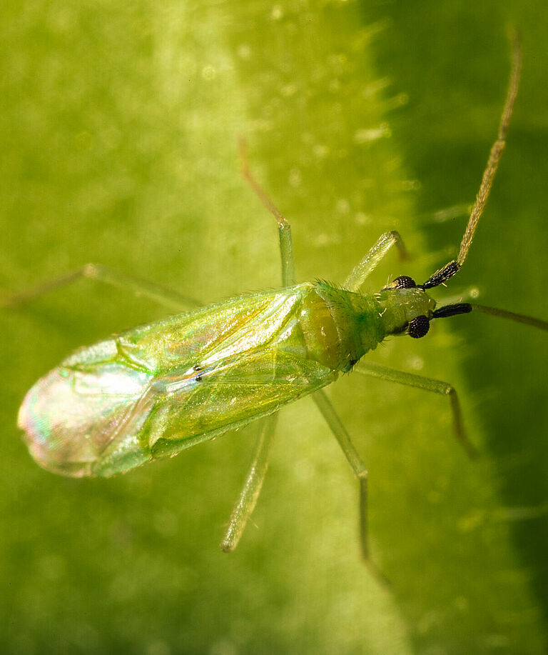 The life cycle of Macrolophus pygmaeus consists of an egg stage, five nymphal instars and the adult insect. Adult females are 3.0-3.6 mm long and the males between 2.9-3.1 mm. They are slender with long legs and antennae. The bugs are green except for occasional small black markings: the first antennal segment is black, and a black stripe runs behind the eyes. The first part of the forewings is a transparent, soft green with a small black spot in the middle. The hind part is colourless with a vague brown marking. Macrolophus pygmaeus has large brown, hemispherical compound eyes that are clearly visible on the sides of the head. The bug has piercing-sucking mouthparts. Females have a large, rounded abdomen within which the ovipositor is visible. Males are somewhat smaller than females and have a thin abdomen.