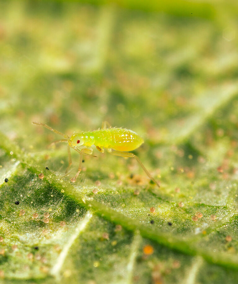 Introduce Mirical at the beginning of the growing season and provide Entofood and/or Artefeed as food source, as the predatory bug population needs time to establish and develop. Mirical can also survive on plant sap, however absence of animal prey slows down the population build-up significantly.