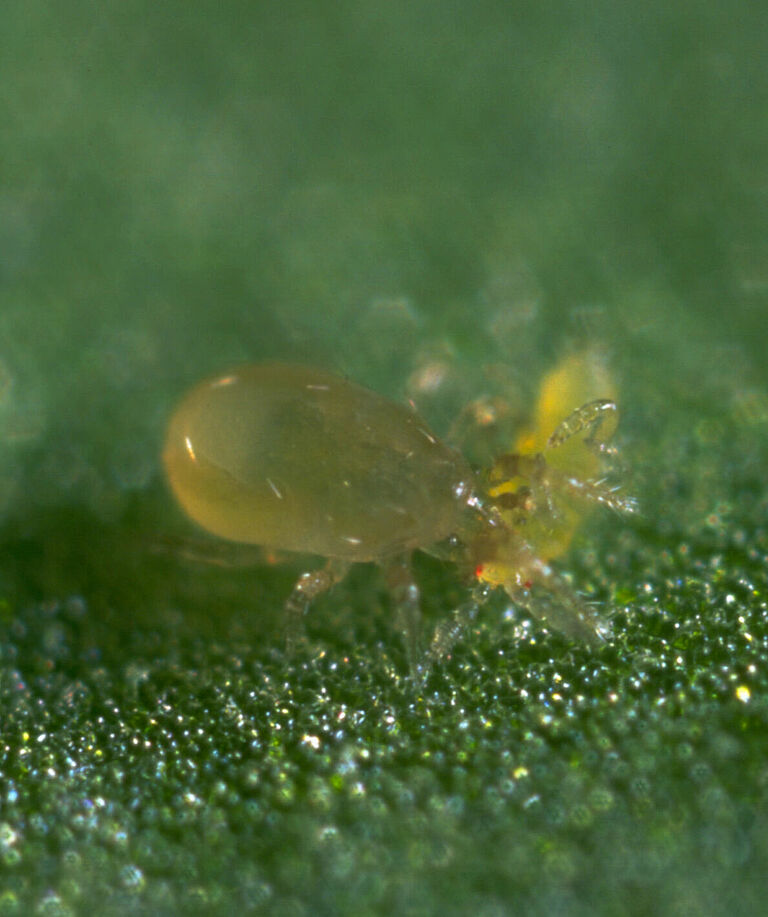 The life cycle of Neoseiulus cucumeris consists of the following stages: egg, larva, protonymph, deutonymph and adult. Eggs are laid on the underside of leaves on leaf hairs or in the axils of main and side veins. They are oval, white and have a diameter of approximately 0.14 mm. The larvae have six legs, are the same colour as the eggs, and are only slightly larger. They do not need to feed to develop into a protonymph. The nymphs are larger than the larvae, have eight legs and are pale brown. Adult mites have eight legs, are light beige and have a flat, elongated body. They are roughly 0.4 mm in length. Males are smaller than females. Protonymphs, deutonymphs and adults are very mobile and actively search for food on the underside of leaves. Due to their size and colour they are difficult to spot in the crop.