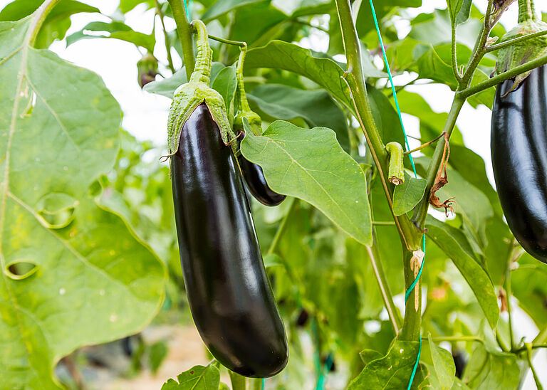 The eggplant is a member of the genus Solanum and is thus related to the tomato and potato. Botanically speaking however, the eggplant is classified as a berry. The fruit contains many small and soft seeds. These seeds taste rather bitter, because they contain nicotinoid alkaloids, just like tobacco.
