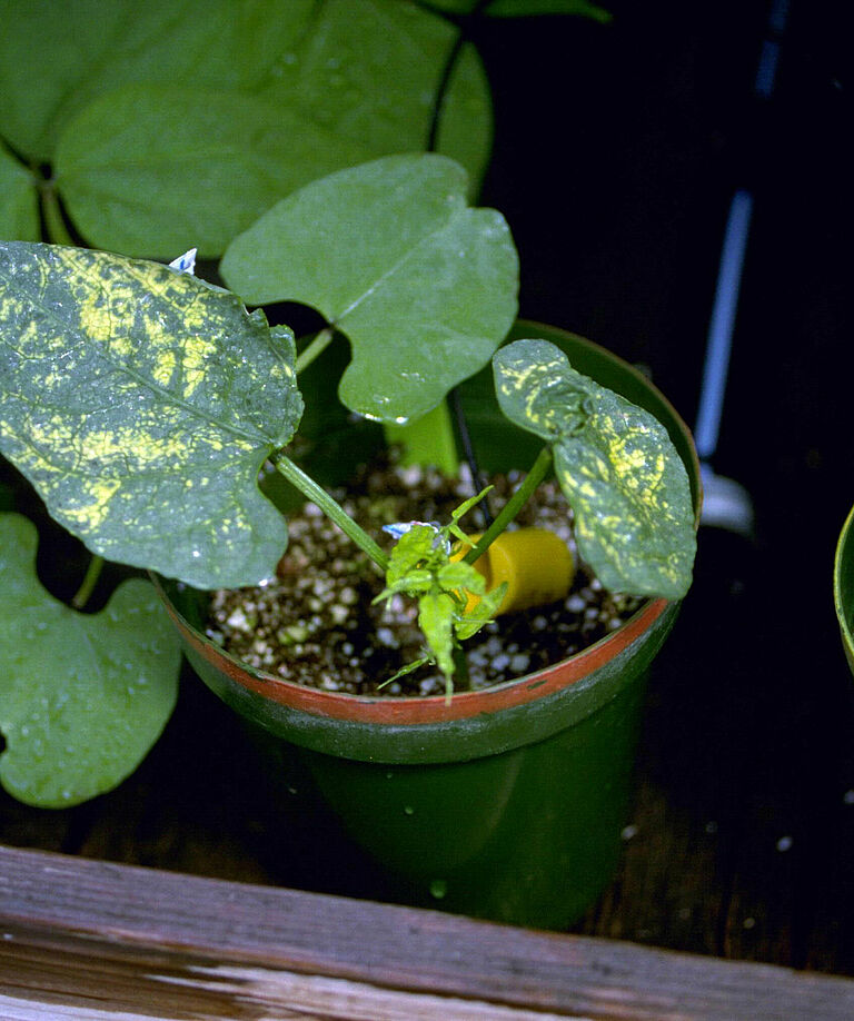 The first symptoms of a cottony soft root (Sclerotinia sclerotiorum) infection are water-soaked lesions at the stem base. The plant above it wilts and rots. White, fluffy fungal mycelium grows on the lesions, giving this disease its name cottony soft rot. In the mycelium, big, dark sclerotia are formed. They can easily be seen with the naked eye and look like rat droppings. The symptoms may occur on stems but also on leaves, fruits and pods.