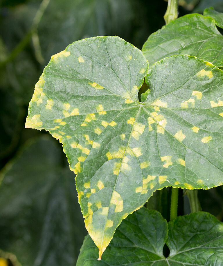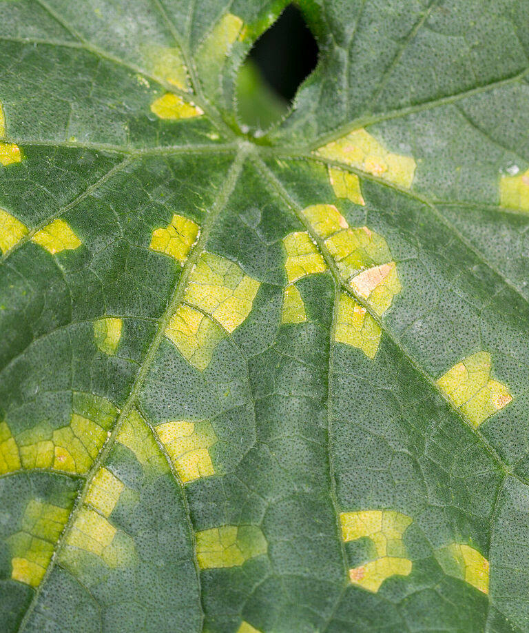 Downy mildew pathogens infect mostly the leaves but occasionally also stems and fruits. They cause lesions on the upper leaf surface, bordered by the veins, which are first yellow and then turn brown. On the underside of the leave fluffy growth appears which is first white and later turns grey-brown. This is actually the sporulation of the pathogens extruding from the stomata.