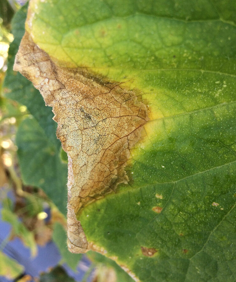 Mycosphaerella cucumis in cucumber causes brown lesions on the foot and higher up on the stem. On the lesions, golden-brown gummy drops occur, hence the name gummy stem blight. On the lesions, black specks, the new fruiting bodies with spores, become visible. On the leaves, round and extending lesions may occur. In cucumber, the most important symptom is internal fruit rot, which can only be recognized from the outside by the small narrowing of the tip of the mature fruits. The symptoms on stems, leaves and inside the fruits may occur together or individually.
