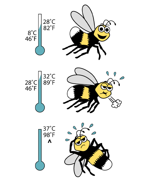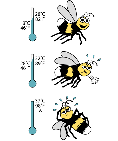 Bumblebees are active at temperatures between 8 and 32 degrees Celsius. Their optimum activity level is at temperatures between 8 and 28 degrees Celsius. At temperatures between 28 and 32 degrees Celsius, their activity level gradually drops. At higher temperatures, the bumblebees stop flying. From the moment, the bumblebees will occupy themselves with cooling the hive until the temperature drops below 32 degrees Celsius again.