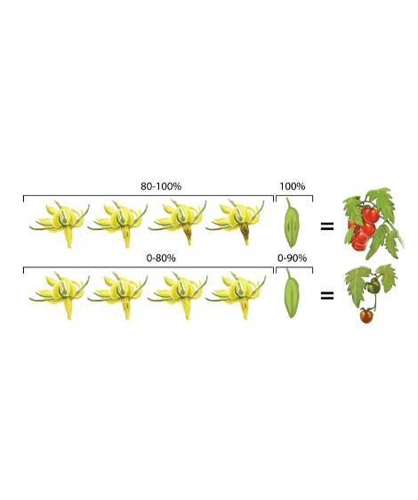 Pollen is released best at a relative humidity (RH) of between 50% and 80%. A relative humidity of more than 80%-85% will result in pollen not being released and the bumblebees will become inactive. Below 50% RH, the germination capacity of the pollen decreases, potentially resulting in problems with fruit setting. The bumblebees will still collect pollen, and leave bite marks, but no fruit will grow.