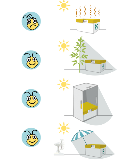 Bumblebees maintain a constant temperature in the hive. If the temperature to which they are exposed is too high for a lengthy period, the hive and the colony may suffer damage. You should therefore position the bumblebee hive in the coolest spot, or at least in the shade, particularly during the warmest part of the day. Ensure that the hive gets some sunlight during the dark winter period. Shade can be provided by the crop, a crate, or other screening methods. During periods with extreme temperatures, extra measures will be required such as active cooling.