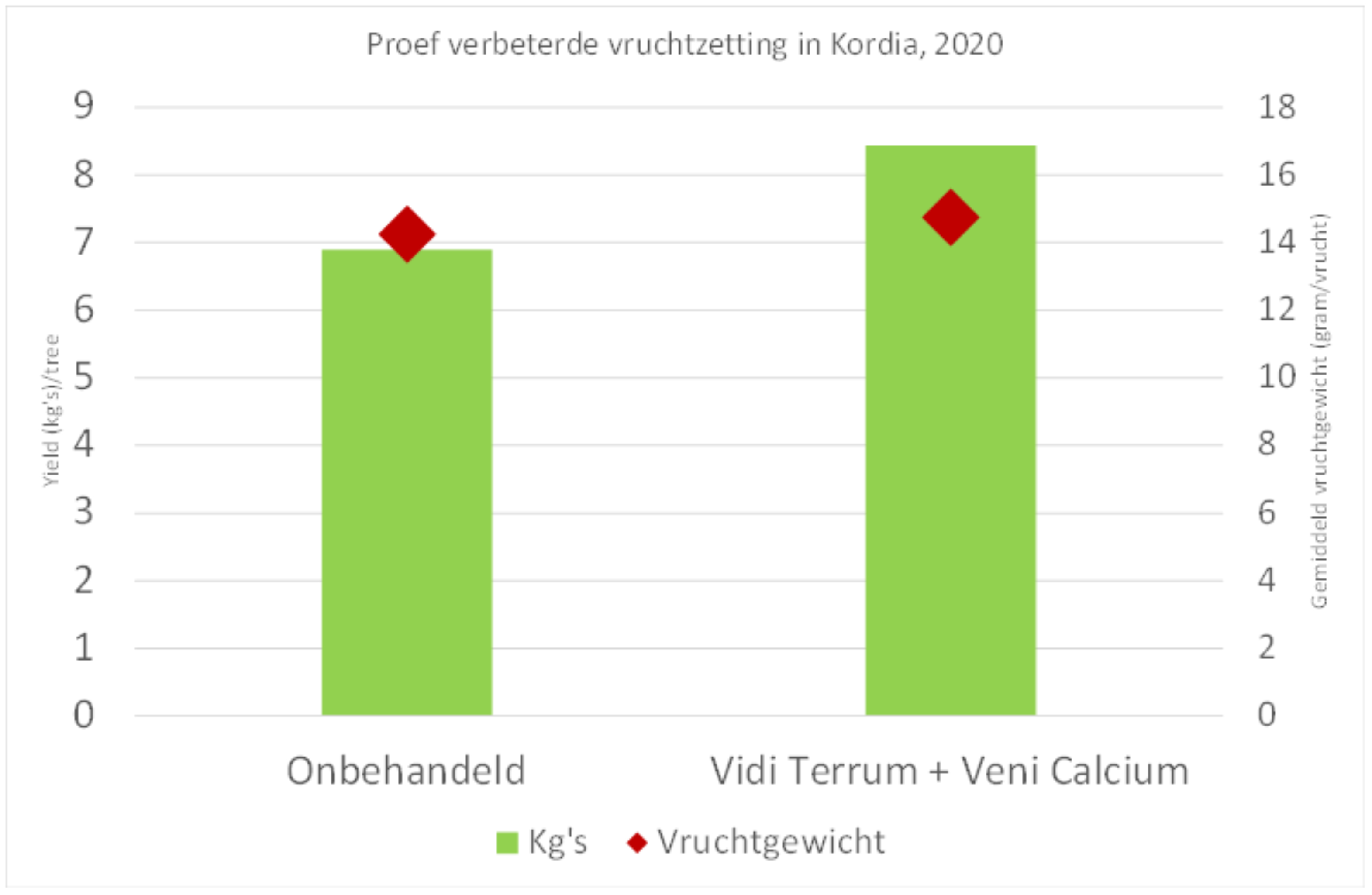 Results from trials, with Vidi Terrum and Veni Calcium, applied prior to and during flowering and after fruit set, at ‘Proeftuin Randwijk’ shows that the average yield, in cherries, could improve with 22%. The trial was conducted in cultivar Kordia, 10 year old trees.
