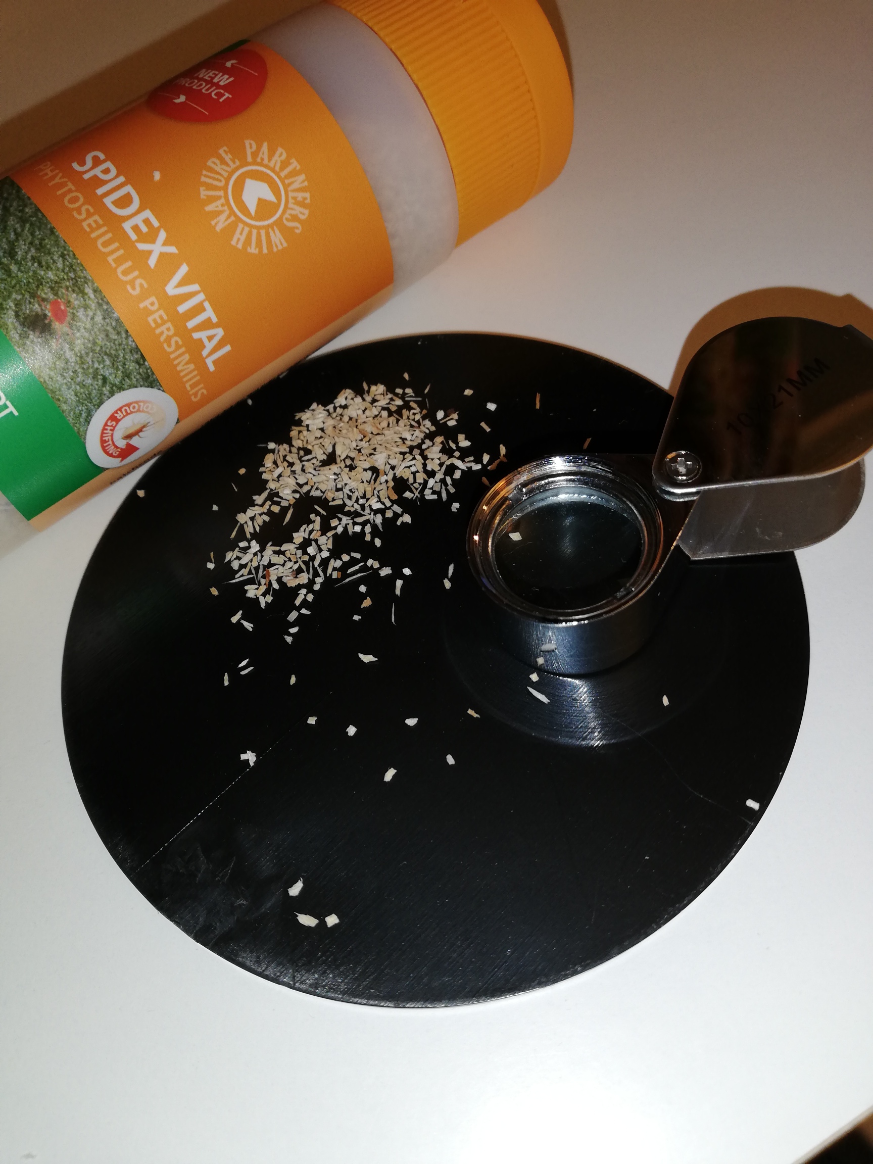 Control of spider mite control is achieved with the use of predatory mites, the most effective being Phytoseiulus persimilis (Spidex). This product is supplied in bottle sizes of 2,000 and 10,000. The mite is a specialist predator of spider mites and does not feed on anything else. As a result it is not usually possible to use this predator in a preventative fashion; instead it is normally introduced as soon as the first spider mites are found in the crop. Adult Phytoseiulus will feed on all stages of spider mites, and reproduce faster than the pest at temperatures between 15-25°C, and a relative humidity above 70%.