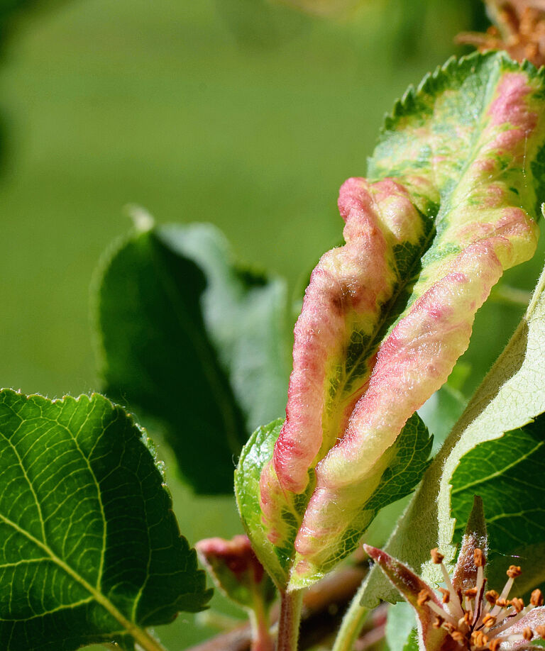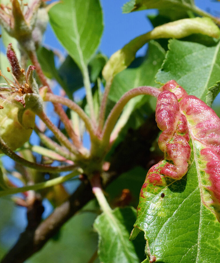 Dysaphis plantaginea lays eggs in autumn in bark crevices on spurs and smaller branches, and on the base of buds of apple trees. The eggs hatch in spring and at first the aphids attack buds, spur leaves and rosette leaves. Later the infestation spreads to young shoots. In spring and summer, reproduction takes place by parthenogenesis, with unfertilized viviparous females continuing to produce new generations of females. By late May or June (in the northern hemisphere) multiple large colonies may be present on the trees. Winged aphids are produced in June or July. They move to plantain trees (Plantago spp.), the summer host. However, breeding on apple can continue until August. In early autumn, winged rosy apple aphids move back to apple for egg-laying.