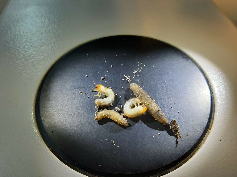 Larval feeding causes brown spots in grasslands, turf and cereal fields. Exit holes of the burrows of the larvae might also be visible. Secondary damage may come from birds and rodents feeding on larvae and digging up turf.