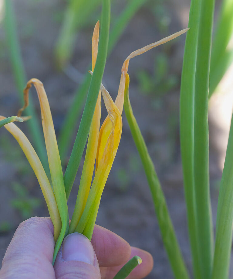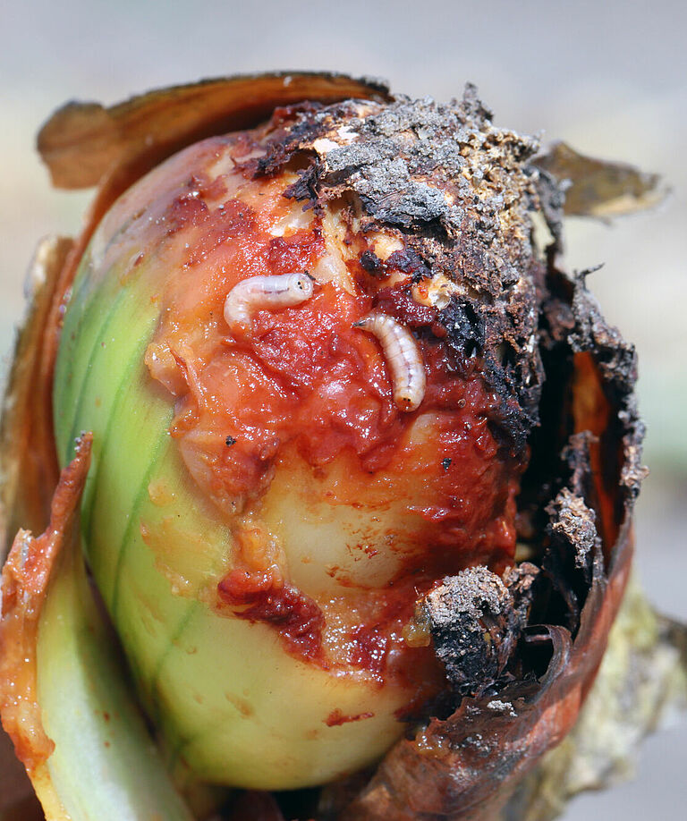 The eggs are laid by the female onion fly on the young leaves, necks of onion seedlings or in the soil close to the base of onion plants. The onion fly larvae that emerge from the eggs tunnel into the onion bulbs, harming the roots and foliage. This leads to retarded growth, decreased yield, or even death of the plant.