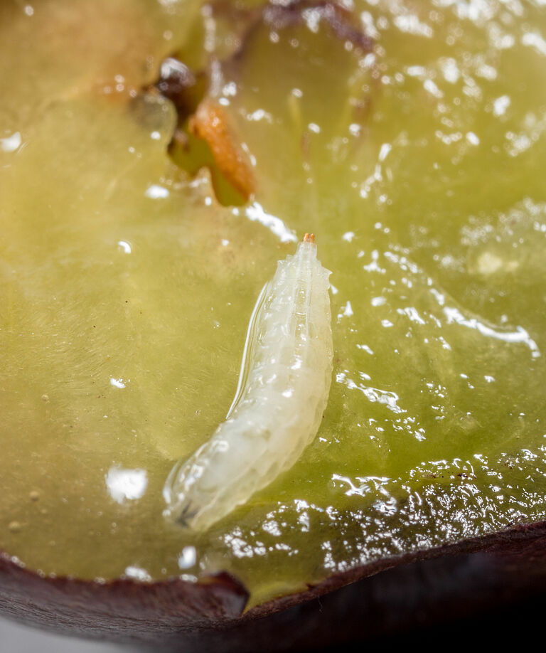 After oviposition, the respiration tubes extend from the fruit but are difficult to see. Larval feeding in the fruit leads to fruit tissue collapse. Even if the fruits have not collapsed, the occurrence of larvae within the fruit makes them unmarketable. The punctures made by the oviposition by D. suzukii exposes fruits to secondary pathogens (e.g. bacteria, fungi and yeasts). Finally, deterioration of fruit can increase its susceptibility to attack by other Drosophila species. D. suzukii has a wide host range, with thin-skinned berries (e.g. raspberries, blackberries, blueberries, strawberries) and stone fruits (e.g. cherries, plums) being particularly susceptible to infestation.