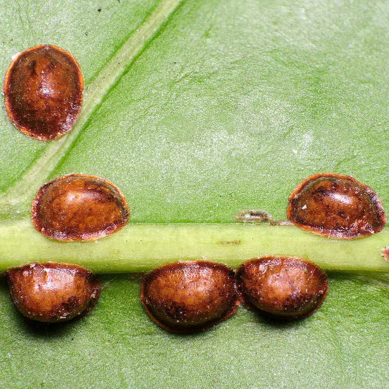 The scales present are usually quite easy to see as shiny brown domes on leaf undersides close to the midribs. They produce large amounts of honeydew causing build-up of sticky deposits on nearby surfaces. The honeydew may attract attendant ants and sooty moulds grow on the sugary deposits. Badly fouled leaves may drop prematurely.