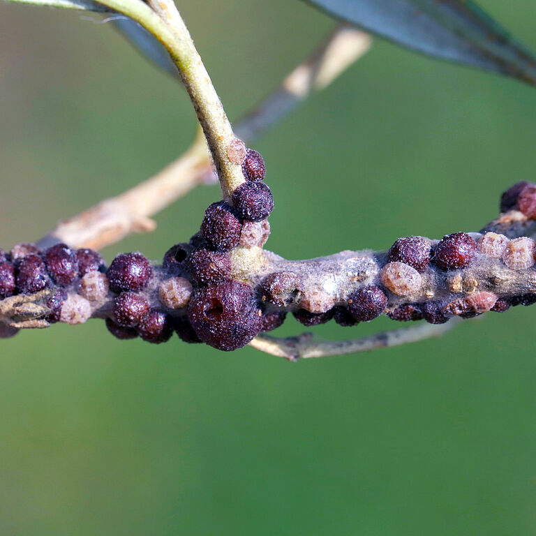 Olive scales reproduce by parthenogenesis. Eggs are protected under the shield until they hatch. The emerging crawlers settle mostly along the main veins on the lower sides of mature leaves. Many young females migrate to twigs and branches later and remain there for the rest of their lives.
